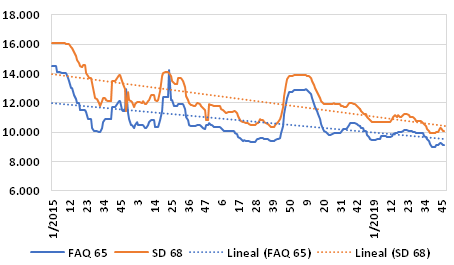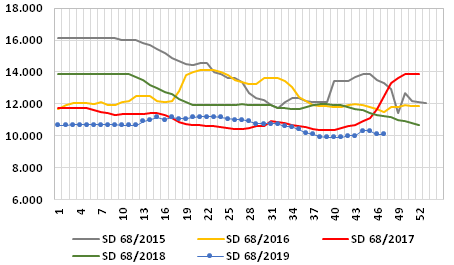 Graph 2: Average weekly prices of SD fishmeal in the main ports of China, 2015/2019, in RMB/t