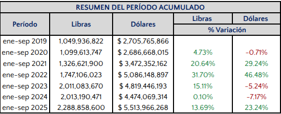 Según las últimas cifras disponibles, en los primeros 9 meses de 2025, Ecuador exportó aproximadamente 1.038 millones de toneladas de camarón, alcanzando una facturación de más de 5.5 mil millones de USD. Esto representa un aumento significativo del 14% en volumen y del 23% en valor en comparación con el mismo período en 2024.