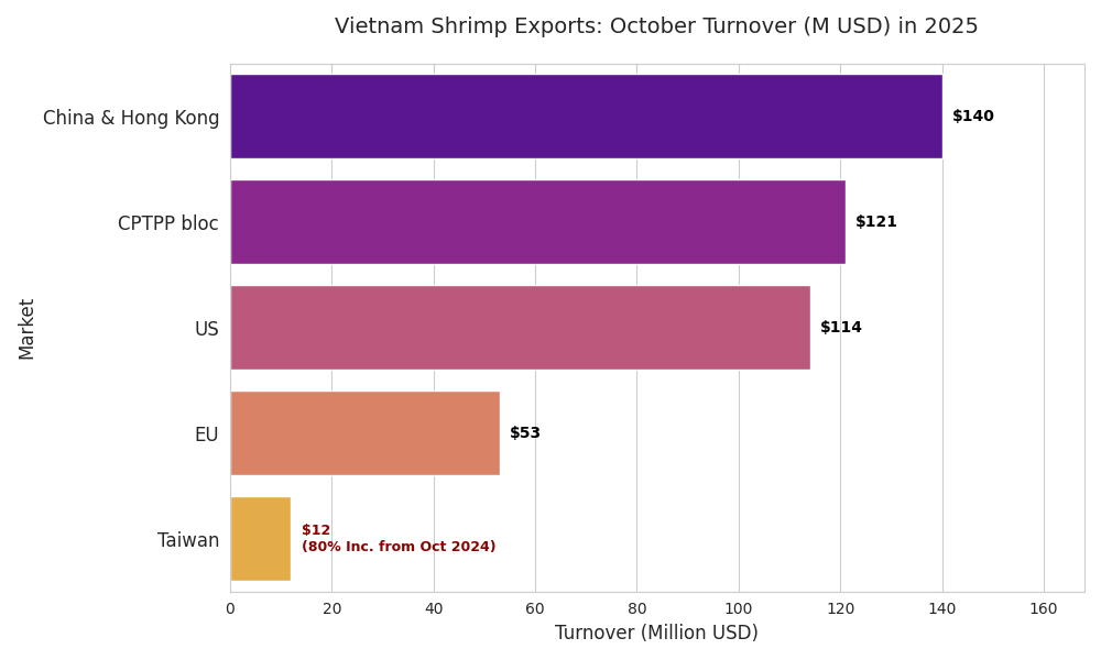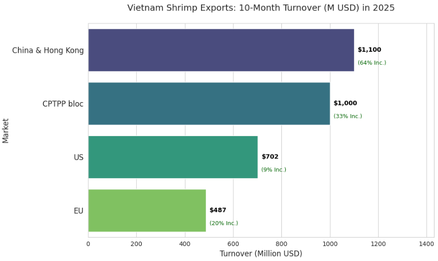 Reflejando esta perspectiva alcista global, las exportaciones de camarón de Vietnam han mostrado un desempeño notable. En octubre de 2025, las exportaciones alcanzaron los $498 millones, marcando un aumento del 26% con respecto al mismo período del año pasado y logrando la facturación mensual más alta desde el comienzo del año. La facturación acumulada desde principios de año hasta fines de octubre alcanzó los $3.9 mil millones, un aumento del 22% en comparación con 2024.