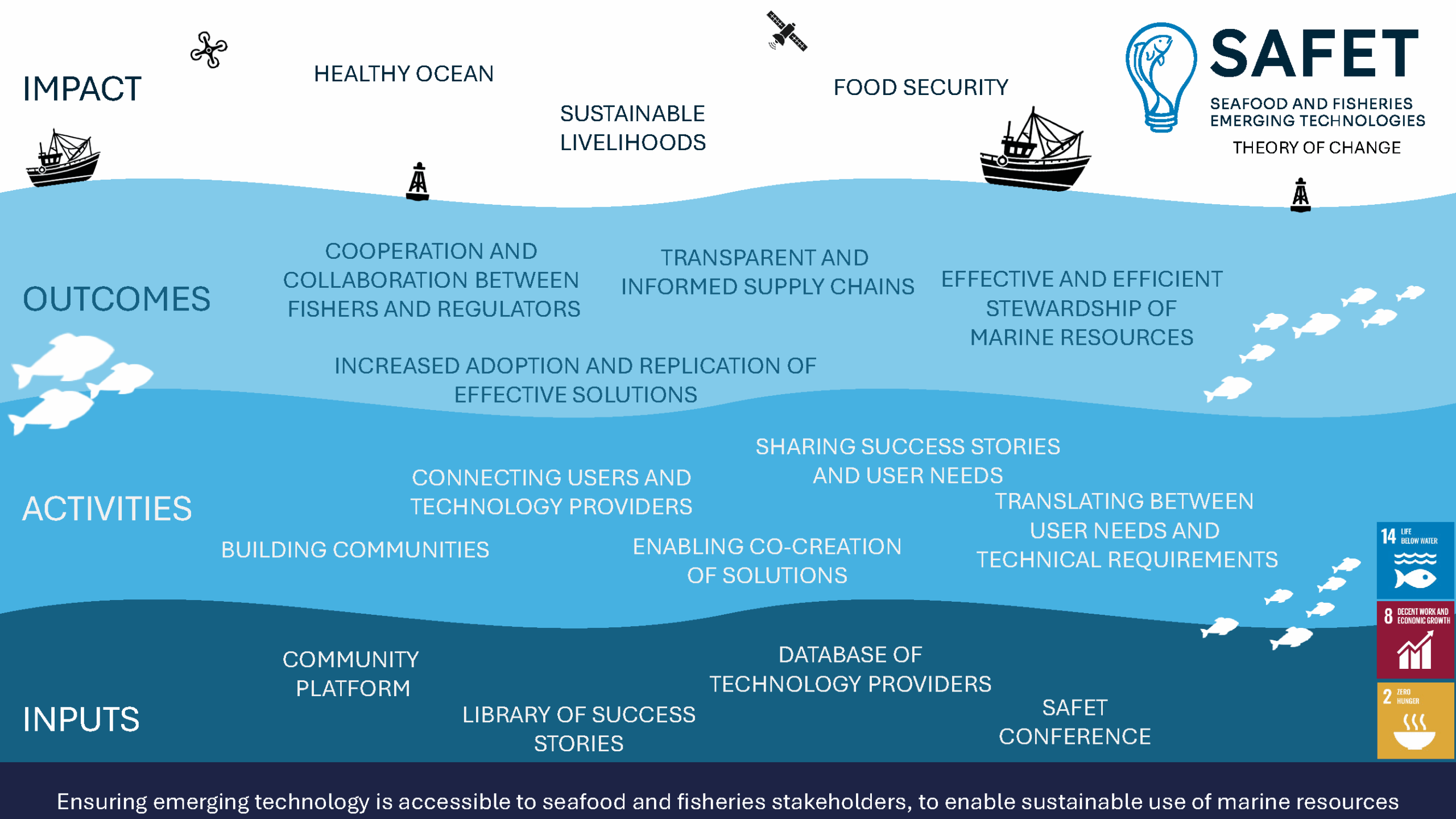 El trabajo de la organización abarca a las personas, empresas, agencias y proyectos que entregan y utilizan tecnología para la pesca sostenible y la gestión de los océanos.