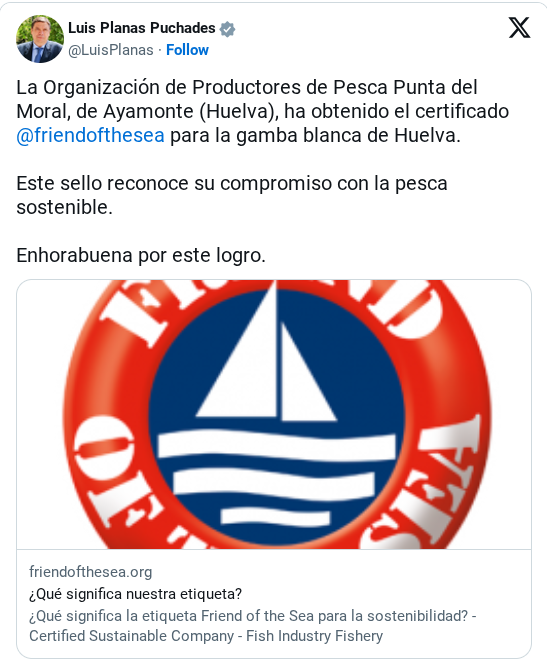A través de su cuenta oficial de X, Planas reconoció el logro, destacando el compromiso de la flota de Ayamonte (Huelva) con la excelencia y la sostenibilidad de sus prácticas.
