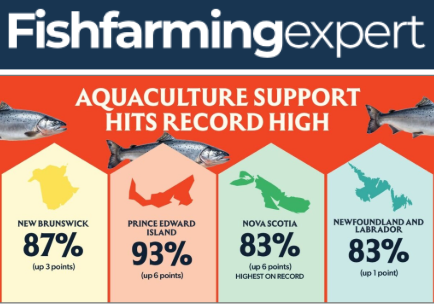 The proportion of people who support finfish farming in Atlantic Canada has grown to a record high 85%, a new survey shows.