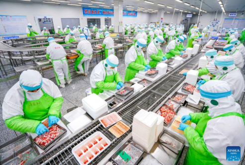 Trabajadores envasan productos de camarón dulce en Shandong Meijia Group Co., Ltd. en la ciudad de Rizhao, provincia de Shandong, al este de China. Como provincia reconocida por su importante economía pesquera marina.
