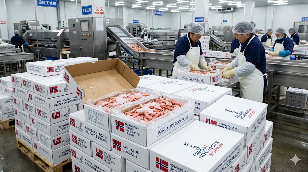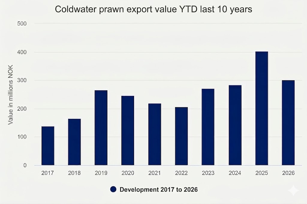 冷凍生エビの輸出は最も大きな伸びを示し、数量は648%増の535トン、輸出額は**372%増(約280万米ドル/NOK 3,000万)**となった。中国が最大市場で、成長の大部分を占めた。