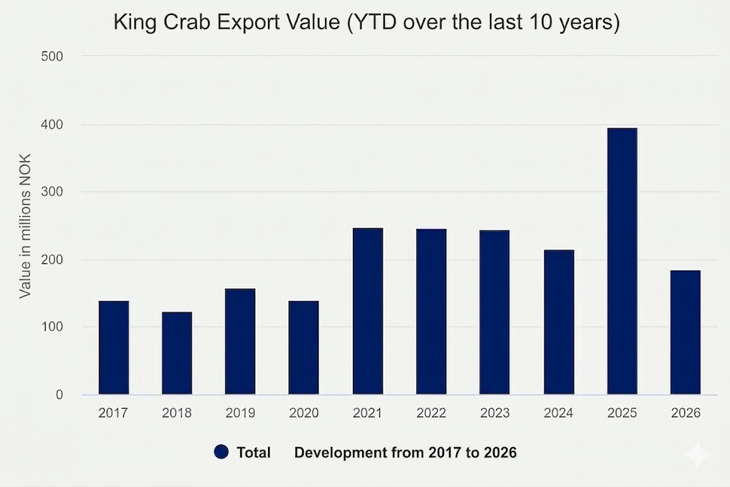 最新データは、ノルウェーの甲殻類セクターにおける明確な二極化を示している。キングクラブは供給制約に苦しむ一方、スノークラブとエビは好調な漁獲と数量増加の恩恵を受けている。