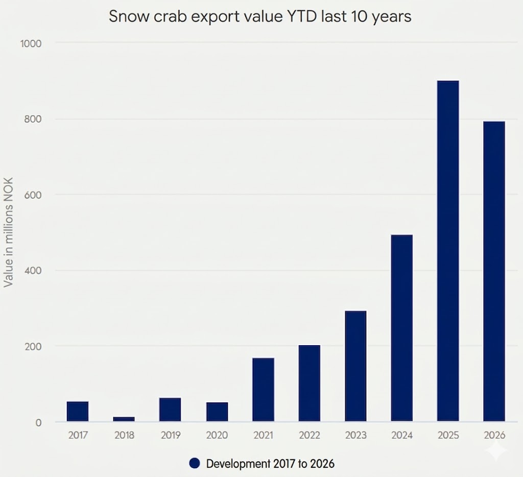 これに対し、スノークラブの輸出は急増した。ノルウェーは3月に2,200トン、約3,820万米ドル(NOK 4億300万)を輸出し、前年同月比で100万米ドル(NOK 1,100万)増、3%増となった。輸出量は35%増加した。