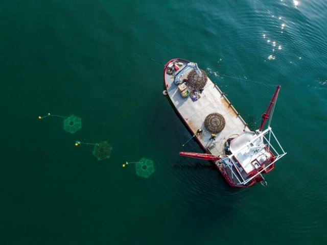 Ostricultores profesionales colocan sustrato para la fijación de larvas en la bahía de Quiberon. Foto: Nicolas Brikke