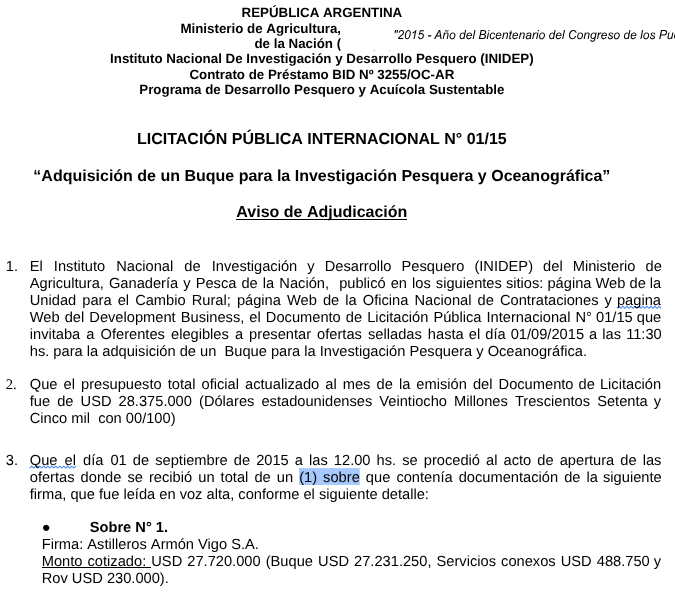 En la adquisición de los buques “Víctor Angelescu” y “Mar Argentino” del INIDEP existieron diversas denuncias públicas. Estas acusaciones se centraron en presuntos "fraudes" en las licitaciones de 2015/17 adjudicadas al astillero español Armón Vigo S.A., y en la supuesta orientación de los pliegos -amañados- para excluir ofertas argentinas. La Licitación Internacional 1/15 (27/11/2015) para construir el buque de investigación “Víctor Angelescu” se adjudicó en 28,3 millones de U$S sin impuestos a este astillero español. Al año siguiente (8/7/2016) se oficializó la licitación para la construcción del buque de investigación costero “Mar Argentino” donde presentaron ofertas la citada Armón Vigo con 7 millones de U$S sin impuestos y modificaciones. Se agregaron los gastos de traslados y mantenimiento, que encarecieron el costo.