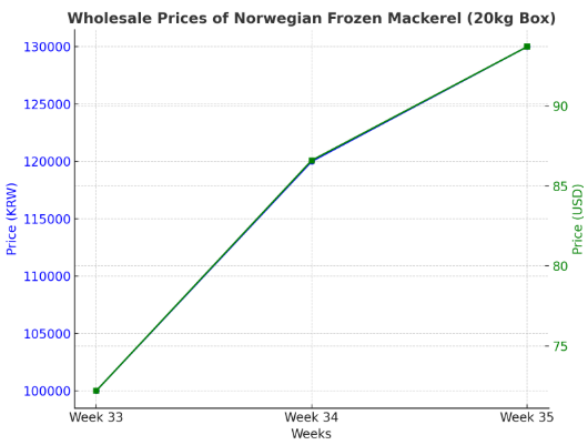 The price spike at the wholesale level is already being felt in Korea. Wholesale prices for a 20 kg box of Norwegian frozen mackerel jumped from KRW 100,000 ($72.2) in week 33 to KRW 120,000 ($86.6) in week 34, a 20% increase. By week 35, prices had climbed again to KRW 130,000 ($93.7), marking a further 8.3% rise. This volatility highlights the vulnerability of the Korean seafood market, which has a high dependence on imports.