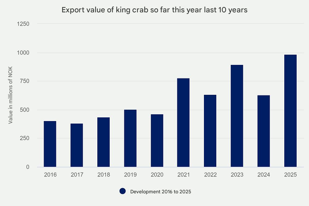 In September, Norway exported 246 tons of king crab (red king crab), generating NOK 169 million. This marks a substantial 59 percent increase in value, or NOK 63 million, compared to September of last year, alongside a 27 percent growth in volume.