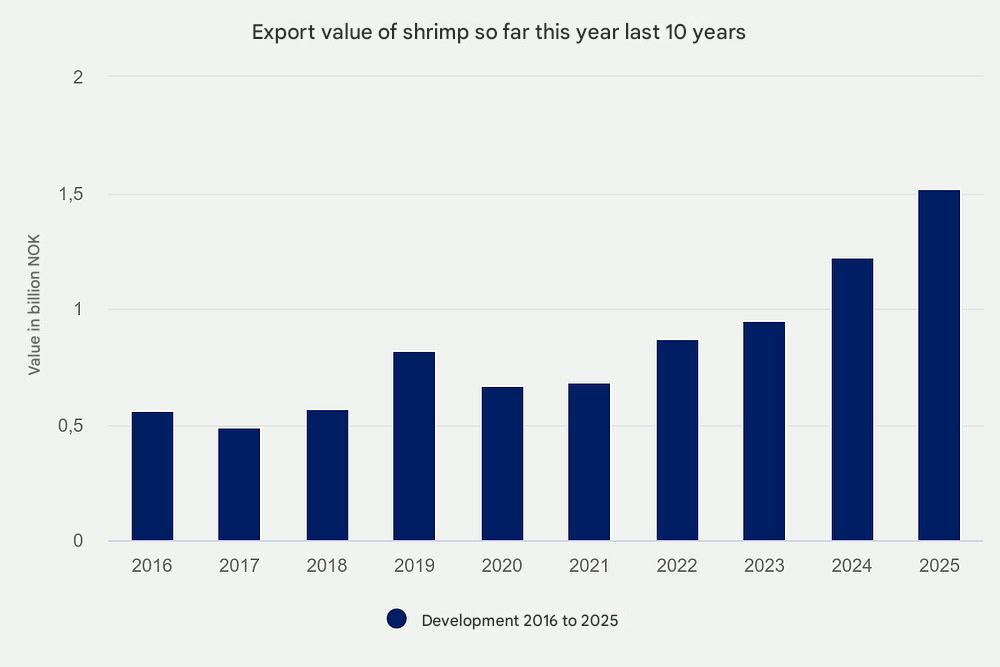 Voraa explained, "The price differences are indeed large. While industrial coldwater prawn to Iceland had an average price of NOK 23/kg in September, the price for frozen raw coldwater prawn to China was NOK 61/kg."