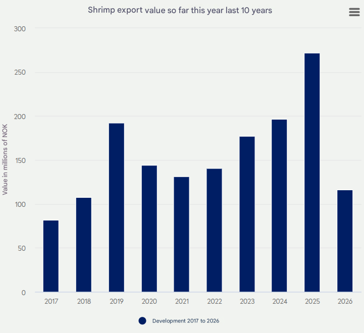 In February, Norway exported 612 tonnes of prawns valued at NOK 66 million (about US$6.8 million).