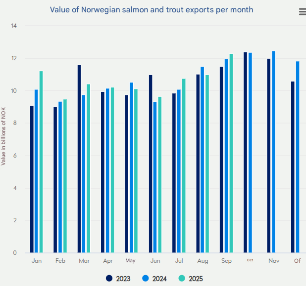 Norway's salmon exports reach US$1.16 billion in September, despite a slight dip in volume, with an impressive 78% surge in the Chinese market. Trout also shows strong performance, particularly in Ukraine.