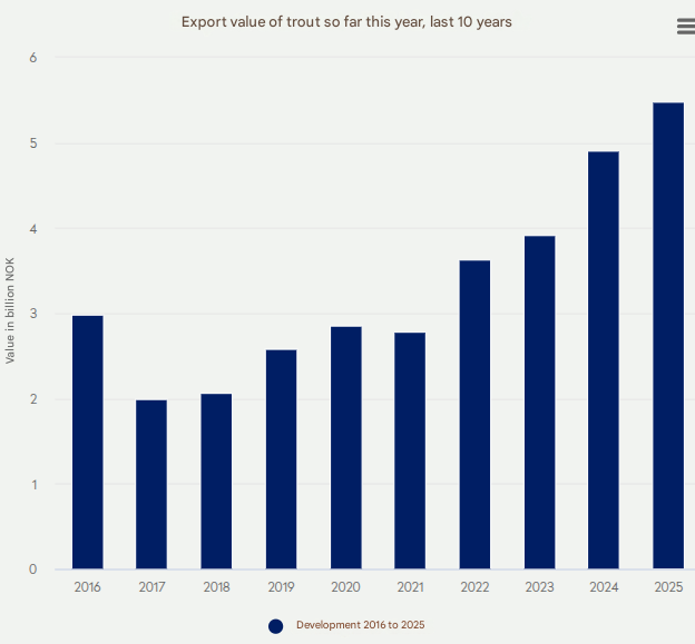 Norway exported 8,400 tons of trout worth NOK 681 million (approximately US$68.29 million) in September. The value increased by NOK 64 million (approximately US$6.42 million), or 10 percent, compared to September last year, and the volume grew by 12 percent.