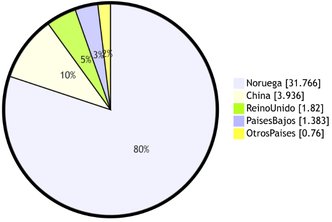 Sin embargo, la cuota general de Noruega disminuyó del 90,6% en 2024, lo que indica que las importaciones se están diversificando hacia otros orígenes, como China, el Reino Unido y los Países Bajos.