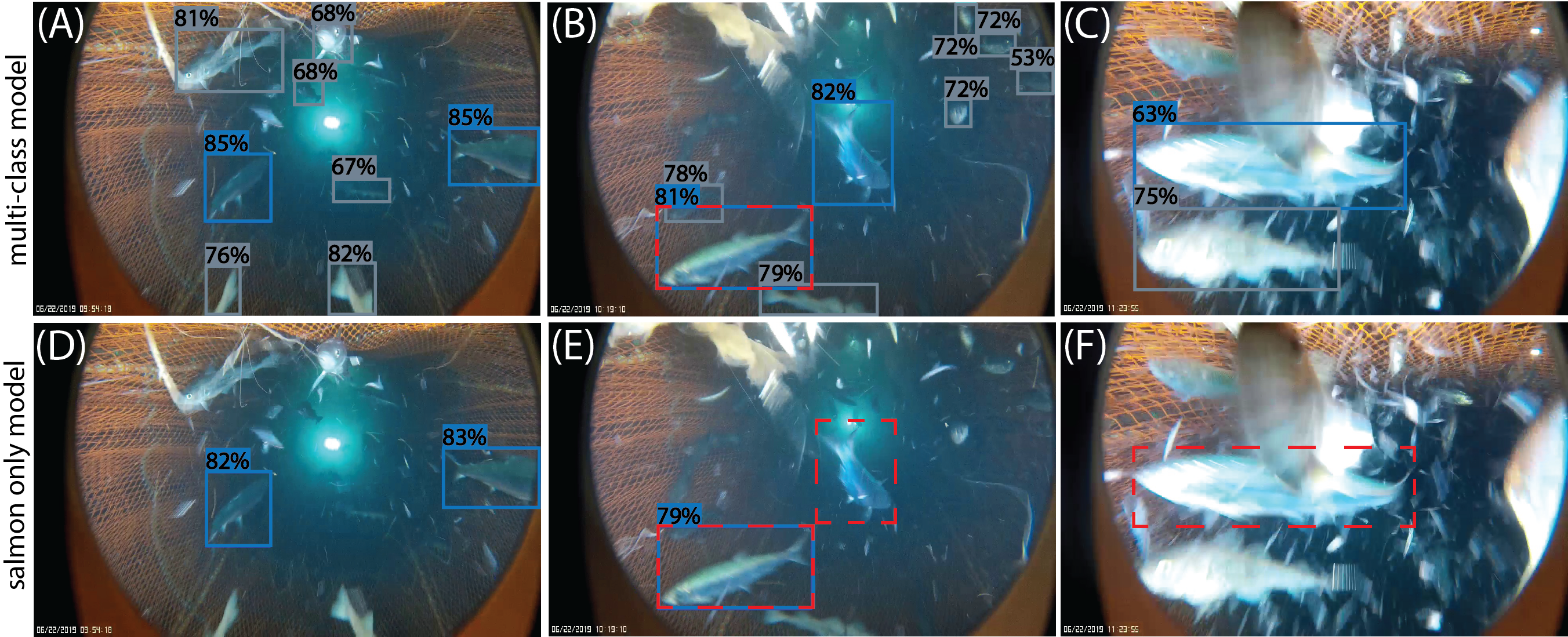 Examples of fish detections from three frames for a model trained to detect both pollock and salmon (top, multi-class model) and a model trained to only detect salmon (bottom, salmon only model). Salmon (white) and pollock (grey) detections are shown with the confidence score of the detection as a percentage at the top of the boxes. False positive salmon detections are present for herring in (B, bottom-left), (C), and (F) and salmon is missed in (D) and (E). Credit: NOAA Fisheries.