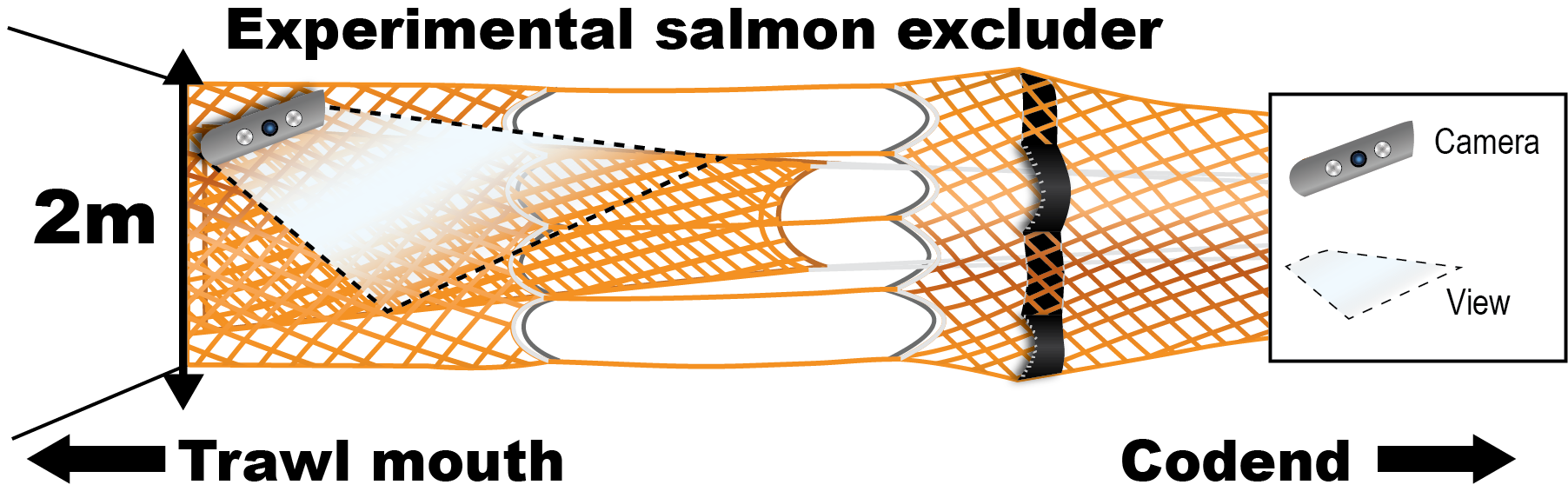 Example image of the salmon excluder that is placed in the last taper section of the net with the camera placement (white box) and the approximate field of view (dashed triangle) shown. The diameter of the net is approximately 2 m at the beginning of the excluder. Credit: NOAA Fisheries.