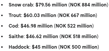 Year-to-date seafood exports have increased by approximately $540 million (NOK 6 billion). This increase is mainly attributed to a $216 million (NOK 2.4 billion) rise in the export value of salmon. Other significant contributors to the year's growth include:
