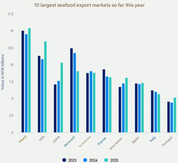So far this year, Norway has exported seafood worth approximately $13.41 billion (NOK 149 billion), an increase of 4.2 per cent from the same period in the previous year. Poland, the USA, and China are the largest markets year-to-date, with China being highlighted as the largest growth market in terms of value.