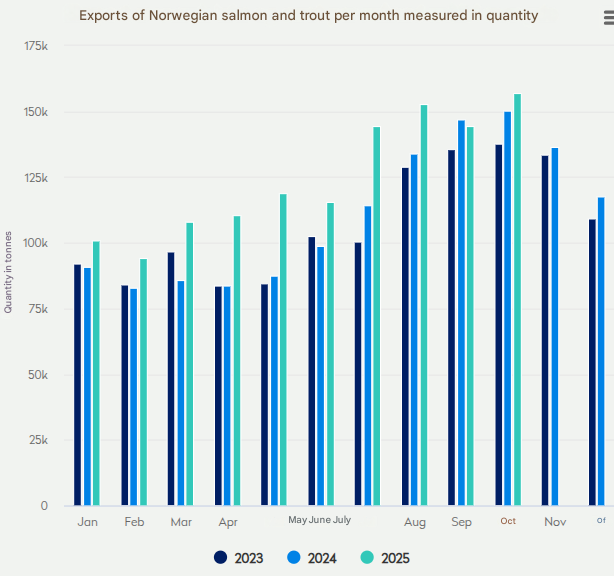 Noruega exportó 148,729 toneladas de salmón por un valor de 12.600 millones de coronas noruegas (NOK), o aproximadamente $1.170 millones de dólares, en octubre. Esto representa un aumento de 816 millones de NOK ($75.9 millones de dólares), o un 7%, en valor en comparación con el mismo mes del año pasado, impulsado por un crecimiento en volumen del 4%.