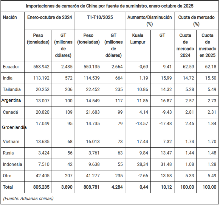Importaciones de camarón de China desde India, Tailandia y Ecuador, enero-octubre de 2025. Haga clic sobre la imagen para ampliarla