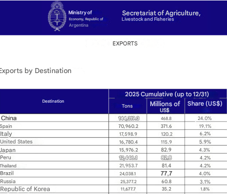 中国は2025年、アルゼンチン産水産物の最大の輸出先となり、スペインを上回った。