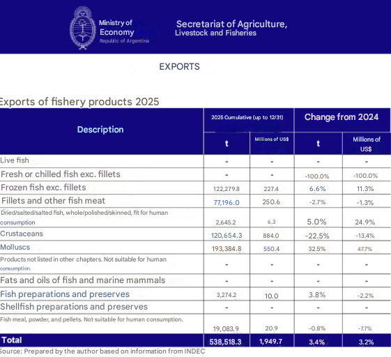 Exports of Pleoticus muelleri shrimp totaled 119,774 tons, representing a 22.3% decline in volume. Shrimp sales generated $867.2 million, down 12.3% compared to prior years. Specifically, whole shrimp exports fell 37.7% in volume and 24.0% in value, marking a drop of more than $125 million from 2024.