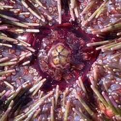 <-- Sea urchins have tube feet like sea stars and a 5-plate mouth that is strong enough to carve depressions into rocks for hideaways. Credit: Jennifer Stock for NOAA