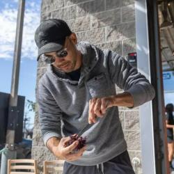 Aaron shucks one of his purple sea urchins. Credit: OoNee Sea Urchin Ranch -->