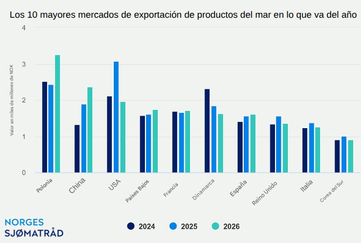 Los mayores mercados para las exportaciones noruegas de productos del mar en febrero fueron Polonia, China y Estados Unidos.