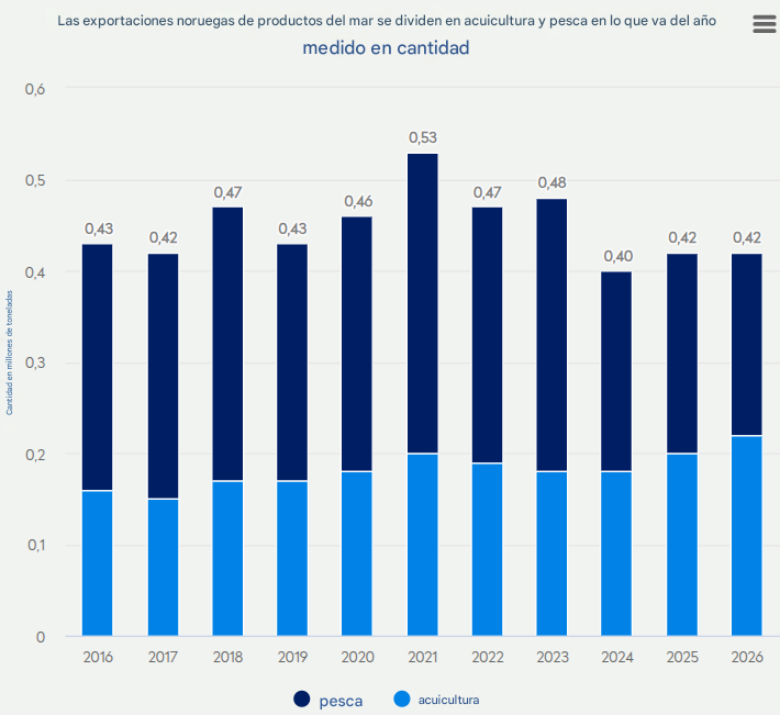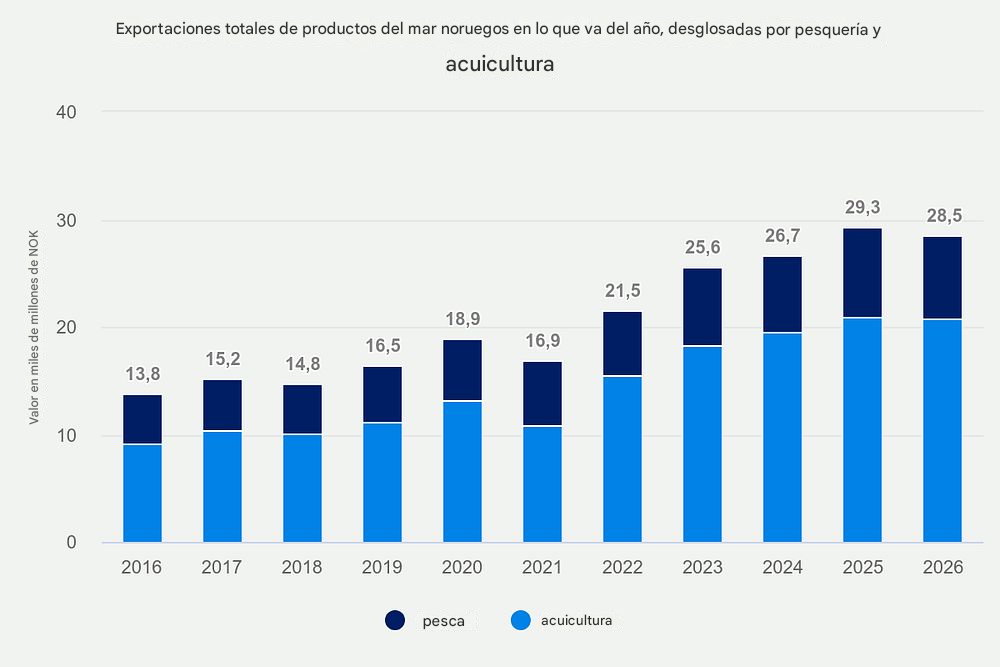 Durante los primeros dos meses del año, Noruega exportó productos del mar por un valor de US$2.95 billion (NOK 28.5 billion). Esto representa una caída de US$80.5 million (NOK 777 million), o 2.7 por ciento, en comparación con el mismo período de 2025.