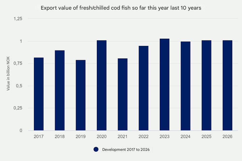 Según datos de la Dirección de Pesca de Noruega, el país exportó 4.006 toneladas de bacalao fresco por un valor de NOK 392 millones (aproximadamente US$36,6 millones) durante el mes. Aunque el valor de exportación se mantuvo sin cambios en comparación con febrero del año pasado, el volumen de exportación cayó un 15%.