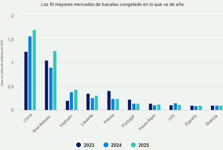 - El Reino Unido, China y Vietnam fueron los mercados más grandes para el bacalao congelado en julio.