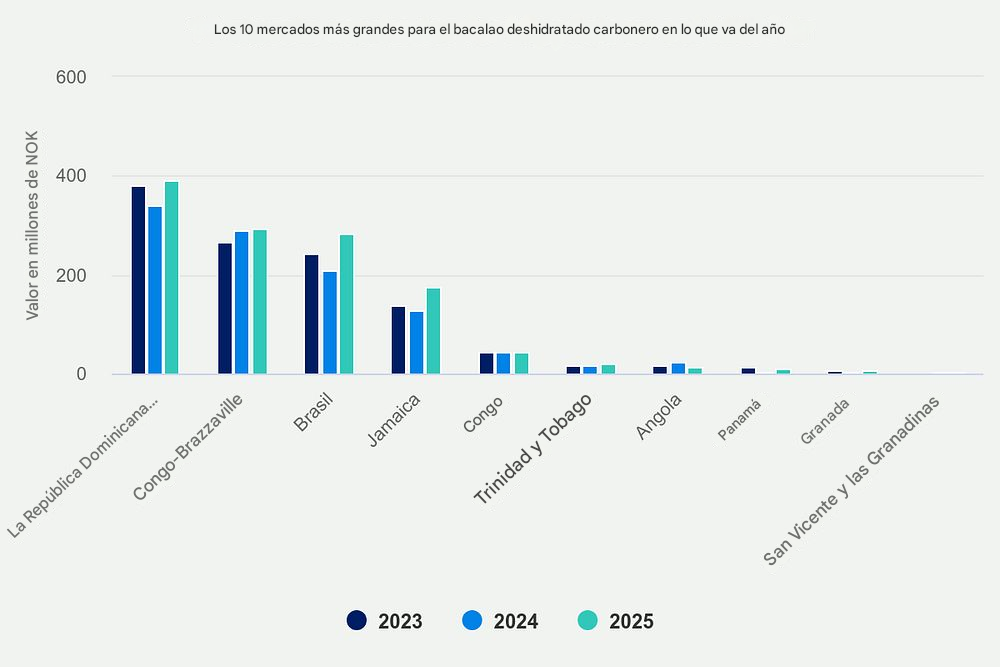 Para el "clipfish" de carbonero, los volúmenes de exportación cayeron un 36% a 2.135 toneladas, mientras que el valor de exportación cayó un 4% a 128 millones de NOK (aproximadamente $12.5 millones de USD).