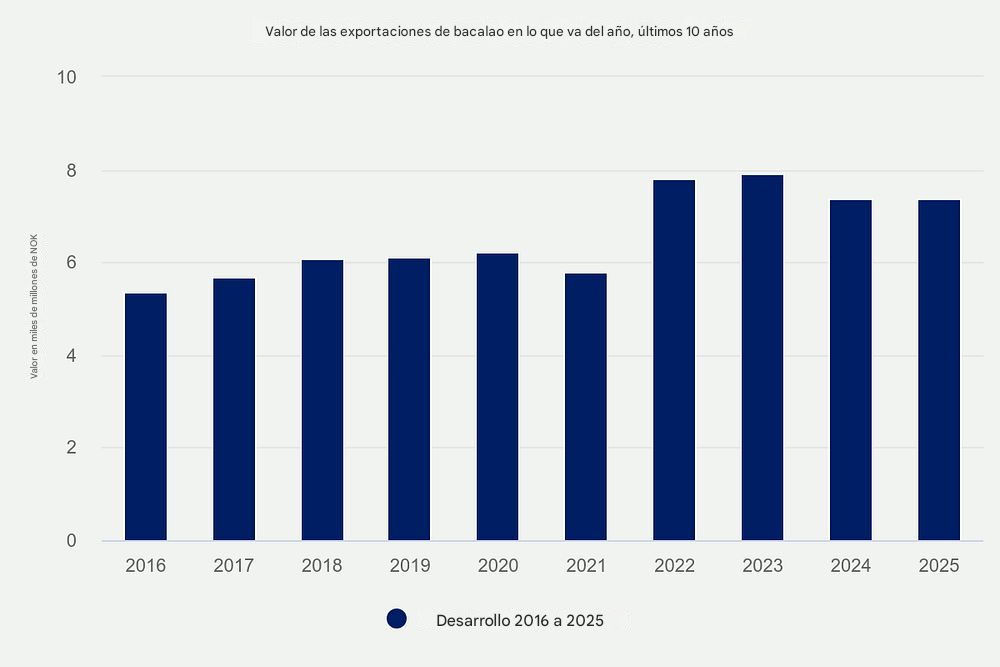 - Noruega exportó 2.055 toneladas de bacalao fresco con un valor de 144 millones de coronas noruegas (NOK), aproximadamente $14.1 millones de USD, en julio.