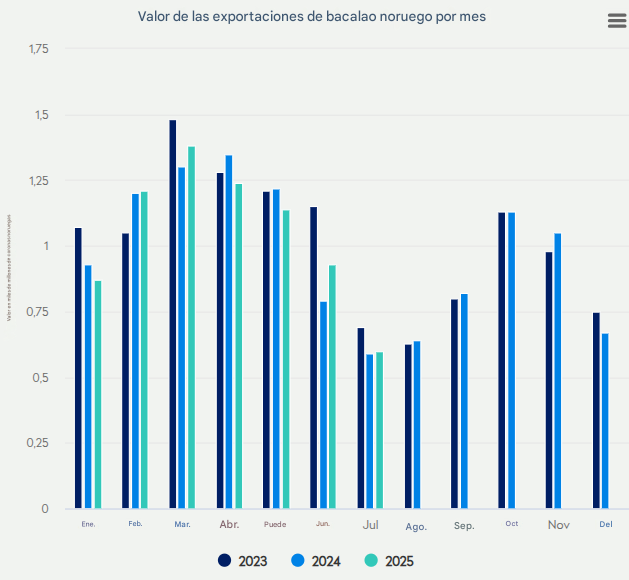 - Noruega exportó 98 toneladas de bacalao seco con un valor de 20 millones de NOK (aproximadamente $2.0 millones de USD) en julio.