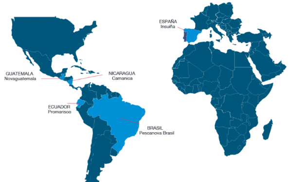 La multinacional española crece un total de 45.000 toneladas al año en sus más de 8.000 Hectáreas de granjas repartidas por todo el mundo. Algunos de los países más importantes para la acuicultura son: España, Nicaragua, Honduras, Ecuador, Brasil y Guatemala.