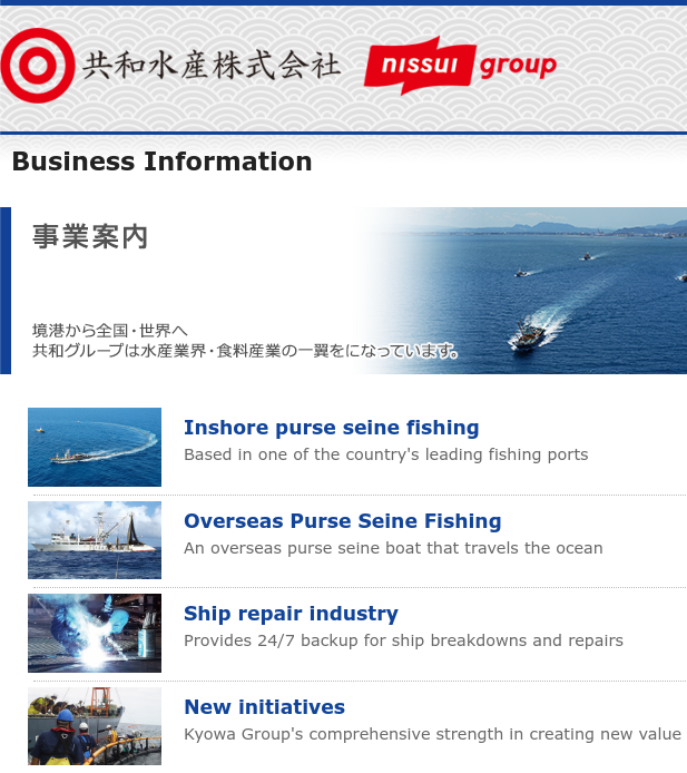 Kyowa Fisheries Group has been operating the fisheries business not only in Japan but also in the oceans of the world for many years since its founding in 1947. Currently, the group has three companies that operate a coastal purse seine fishing business, an overseas purse seine fishing business, a fresh fish wholesale business, and a ship repair business.