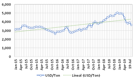 Graph 1: Average CIF customs price of US imports of frozen pangasius fillets (HS 0304620020), 2015–2019, USD/t