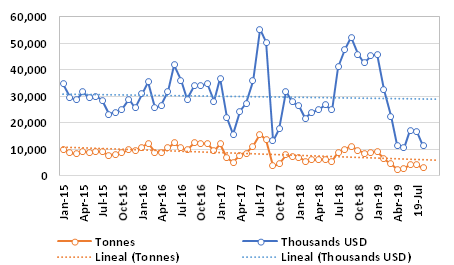 In August, 3,153 tons of frozen pangasius fillets were entered for a CIF value of USD 11,479,000, 26% lower volume and 31% value than what was imported in the previous month and 69% lower volume and 76% value than what was imported in August 2018 .