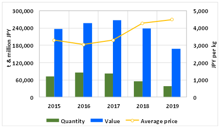 In the period totalled 37,545 tons for USD 168,422,000, 33% lower volume and 29% lower value than in the previous year. Vietnam was the supplier of 36,925 tonnes while China was the source of 619 tonnes.