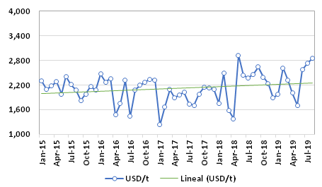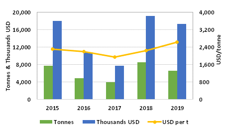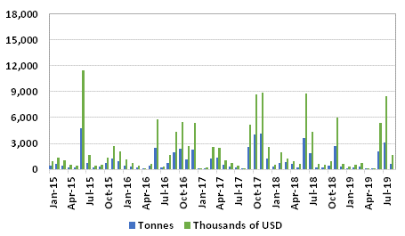 Exports in the first eight months of the year totaled 6,553 tonnes for USD 17,254,000, 23% less in volume and 10% in value than in 2018.