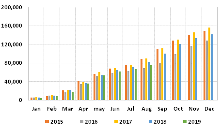 Graph 2: Japanese imports of surimi, cumulative monthly, in tonnes, 2015/2019