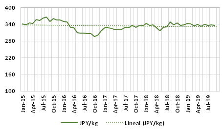 The average CIF price of itoyori surimi was JPY 336/kg at Japanese Customs in September, down 1% on that of the previous month and similar on that of September 2018. In the first nine months, the average was JPY 338/kg, up 1% on that of the same period in 2018.