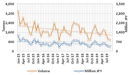 Japanese imports of itoyori surimi in the month analysed reached 970 tonnes, worth about JPY 326 million CIF, which indicates 6% lower volume and value in relation to August being similar in volume and down1% in value compared to September 2018.