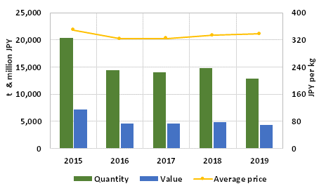 Graph 2: Japanese imports of itoyori surimi,(HS 030499993), 2015/2019