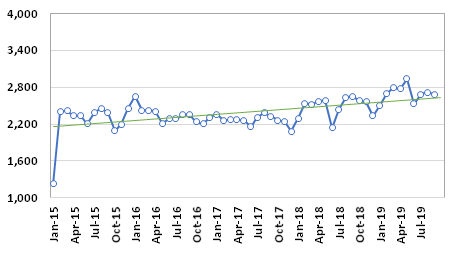 At US Customs, the average price of Alaska pollock surimi (Gadus chalcogrammus) (HS 0304991130) was USD 2.69/kg in September. This price is 1% lower than August and 1% higher than September 2018. In the first nine months of the year, the price averaged USD 2.74/kg, up 7% on that of the same period in 2018.