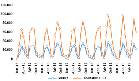 So far this year, Japan has been destined for 61,522 tonnes for USD 167,176,000, followed by Korea with 55,513 tonnes.