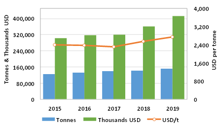 In the period, exports reached 150,564 tonnes worth USD 412,540,000, 2% less in volume and 7% more in value than in the previous year.