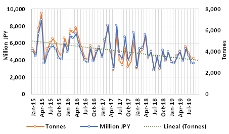 During the month analysed, imports of frozen bigeye reached 4,154 tonnes, worth JPY 3,638 million, down 1% in volume and similar in value on those registered in the previous month and up 40% in volume and 19% in value on those of September 2018.